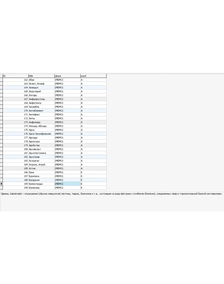Данная MySQL база состоит из 284 описаний архитектурных терминов.