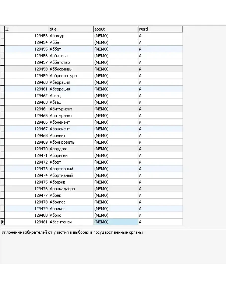 База данных толкового словаря живого великорусского языка В. Даля. Содержит толкование 44701-ого слова.