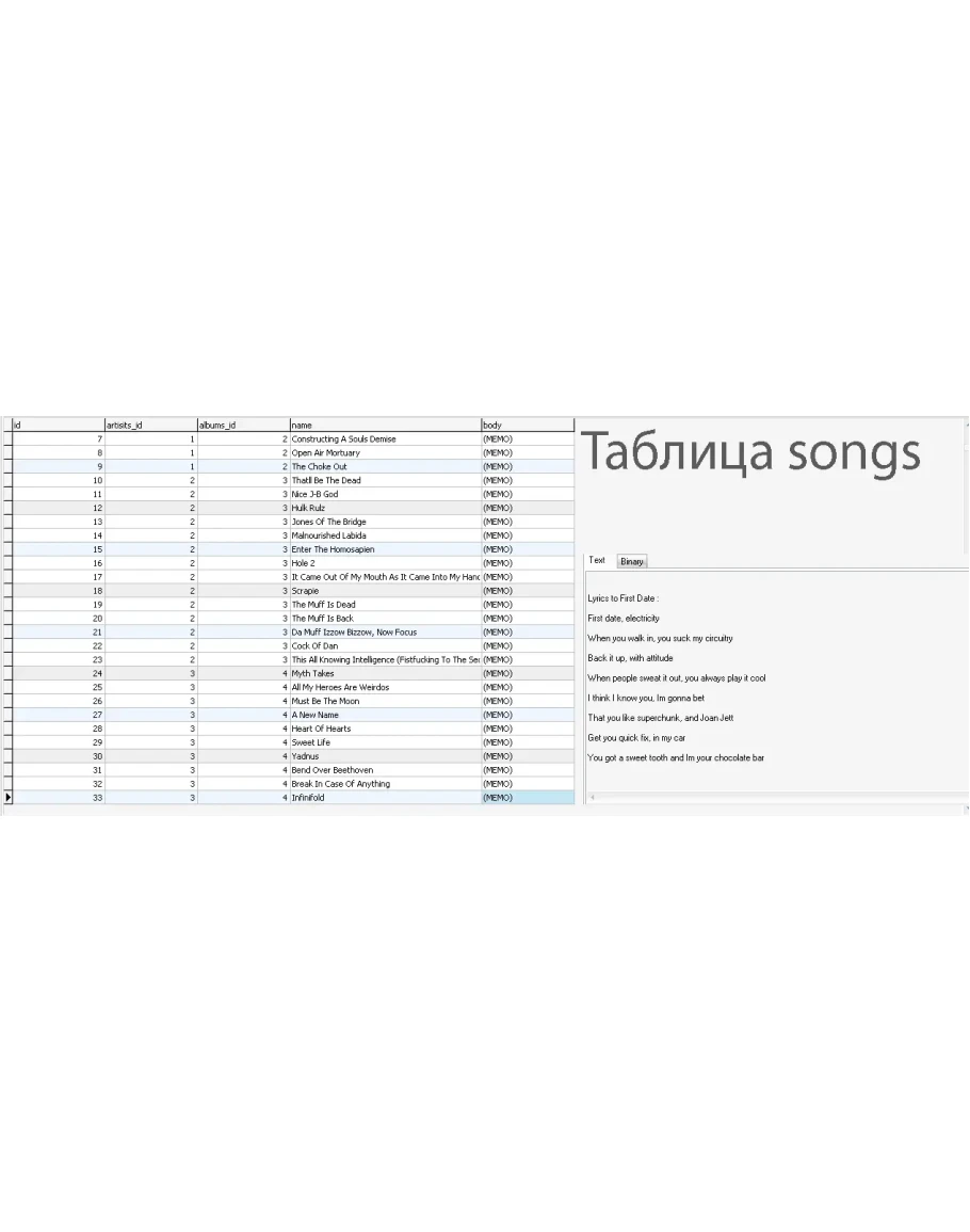 Крупнейшая база данных текстов зарубежных песен со всех концов мира (источник lyricsmania) в MySQL, состоящая из 851805 песен, из 68763 альбомов 49975 артистов.