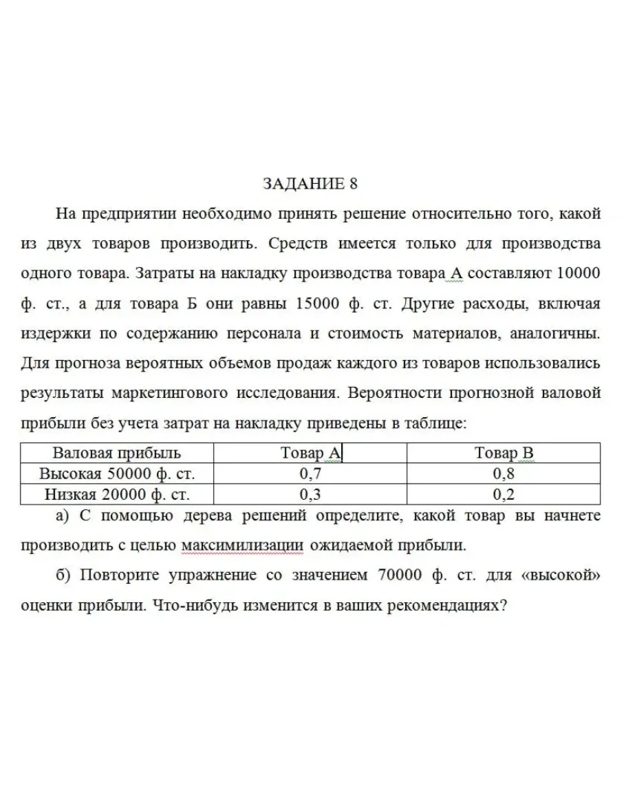 На предприятии необходимо принять решение относительно того, какой из двух товаров производить. Средств имеется только для производства одного товара. Затраты на накладку производства товара А составляют 10000 ф. ст., а для товара Б они равны 15000 ф. ст. Другие расходы, включая издержки по содержанию персонала и стоимость материалов, аналогичны. Для прогноза вероятных объемов продаж каждого из товаров использовались результаты маркетингового исследования. Вероятности прогнозной валовой прибыли без учета затрат на накладку приведены в таблице: