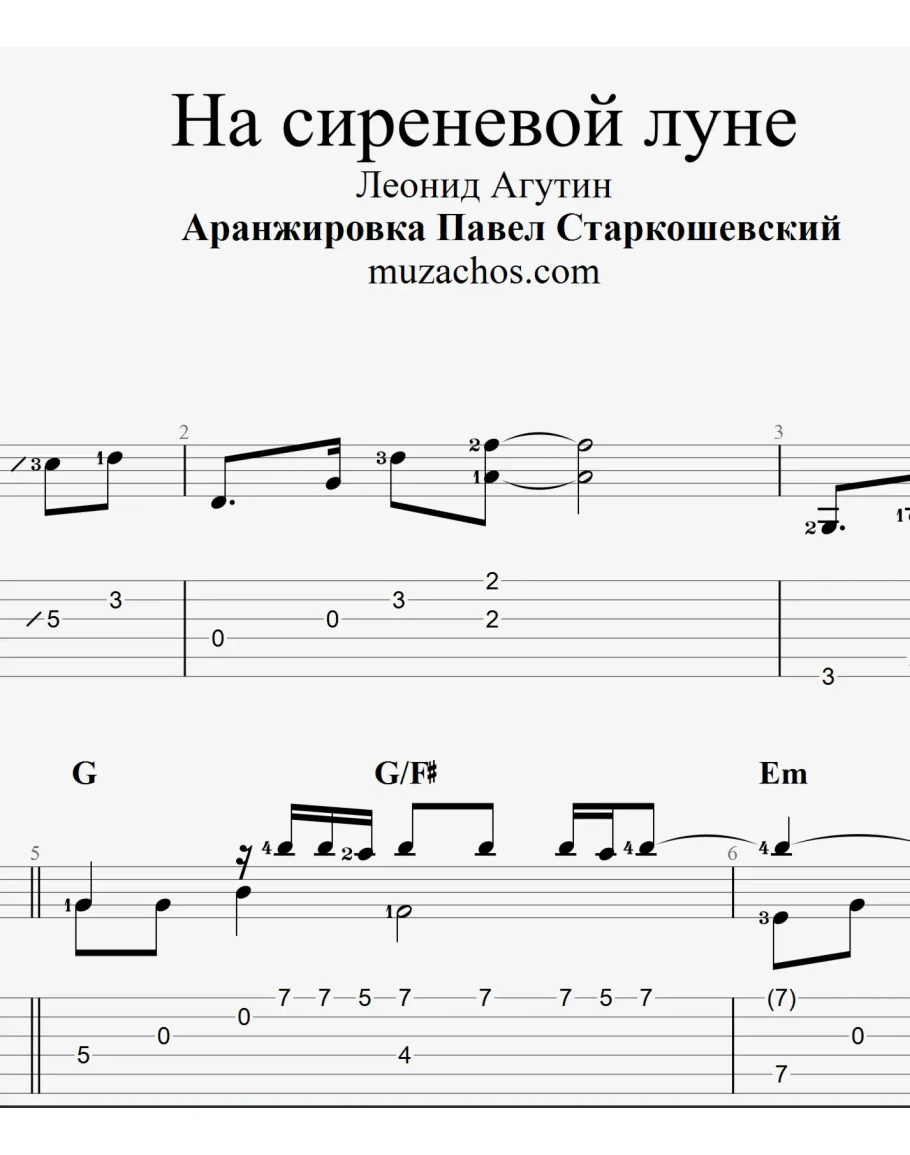 Ноты для одной гитары с аппликатурой левой руки и табулатура к переложению песни Леонида Агутина – На сиреневой луне. Форматы: pdf, guitar pro 6 и 7