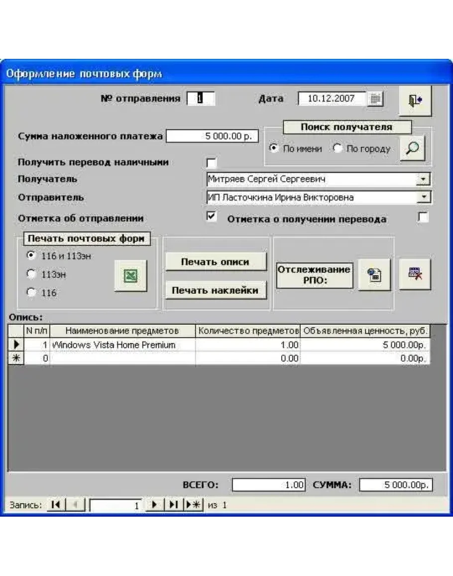 Быстрое оформление почтовых отправлений наложенным платежом. Необходимо только заполнить необходимые поля данных и программа сама распечатает формы 116 и 113эн (образца 1.05.2007 г.) в Excel.