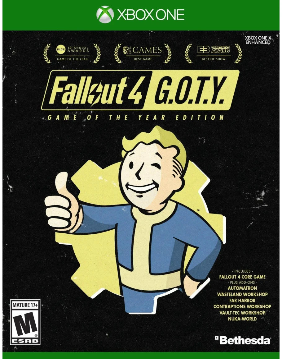📝 Описание Игры: В Fallout 4 G.O.T.Y. вошла базовая версия игры и все 6 официальных дополнений - Automatron, Wasteland Workshop, Far Harbor, Contraptions Workshop, Vault-Tec Workshop и Nuka-World.