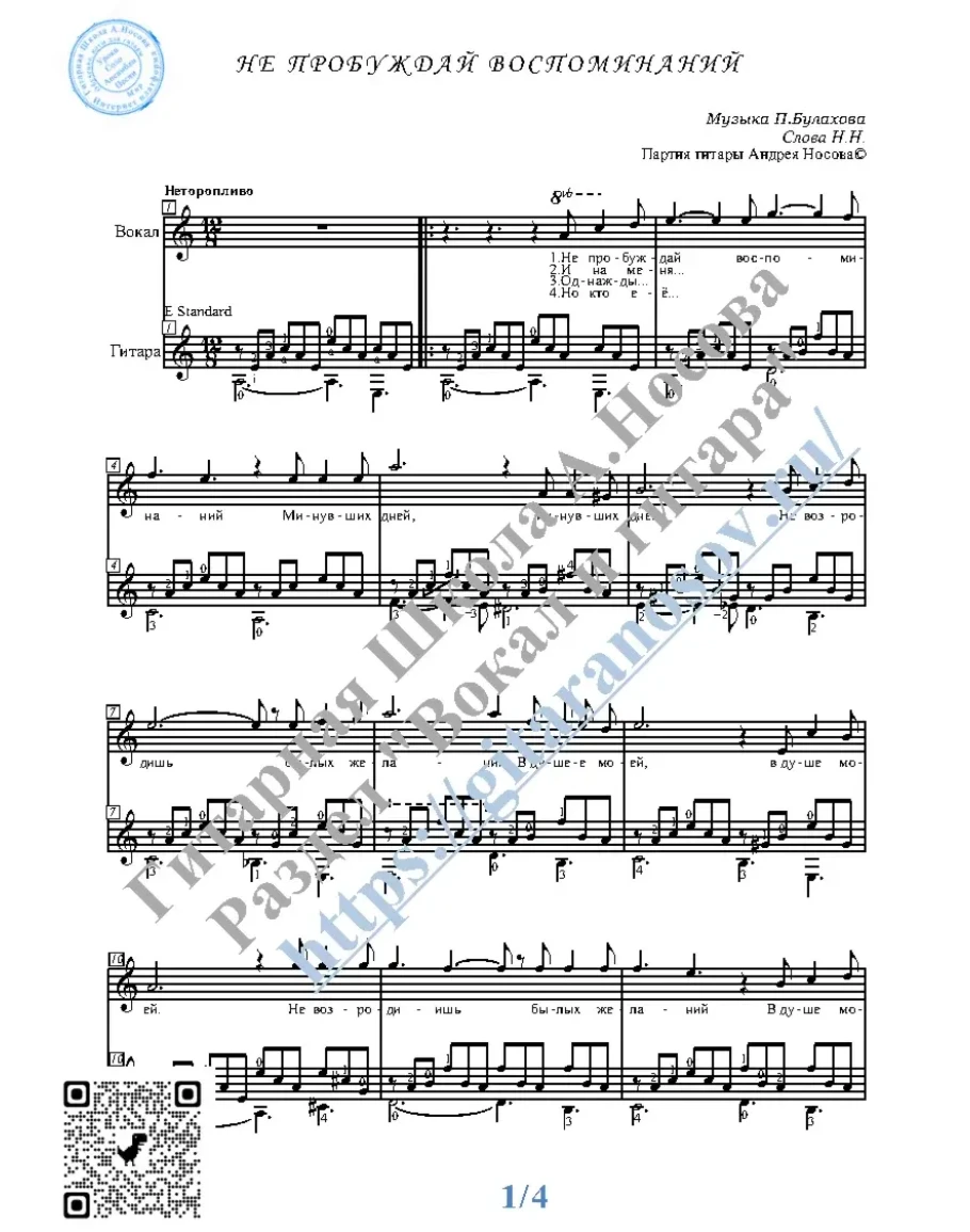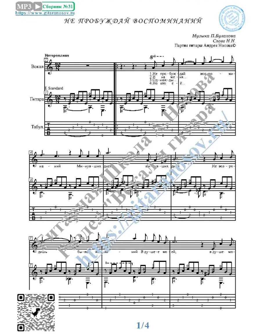 Кликните "Подробнее" для получения дополнительной информацииВашему вниманию предлагается композиция "Не пробуждай воспоминаний (муз.П.Булахова, сл.Н.Н.)", предназначенная для вокала в сопровождении 6-ти струнной гитары. Запись выполнена нотами и включает в себя партию вокала с подтекстовкой, партию гитары с подробнейшей аппликатурой и текст песни (НА РУССКОМ).