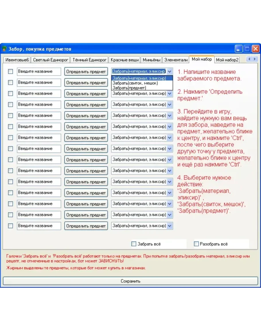 - После победы, забирает выбранные вещи в сундук, остальные продаёт или разбирает.