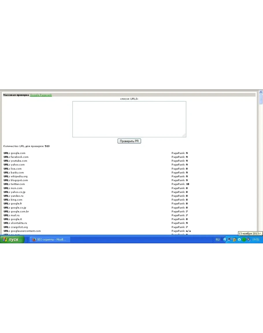 Скрипт предназначен для быстрого определения значений Google PageRank сразу для множества сайтов. Версия от 13.11.2013 - в связи с очередным обновлением алгоритма Google в скрипт внесены необходимые изменения.