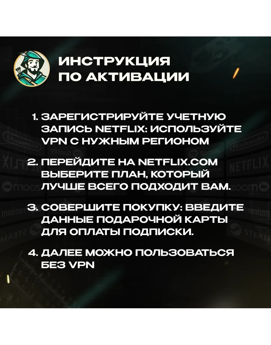 Netflix закрыл доступ для региона России, Российским пользователям для просмотра контента данного товара потребуется постоянное подключение к европейскому ip адресу. Пожалуйста, убедитесь перед покупкой, что ваш аккаунт зарегистрирован в КОЛУМБИИ. Если у вас нет учетной записи, вам необходимо создать ее с помощью любого бесплатного спец. ПО-сервиса, который поддерживает КОЛУМБИЙСКИЙ IP-адрес.