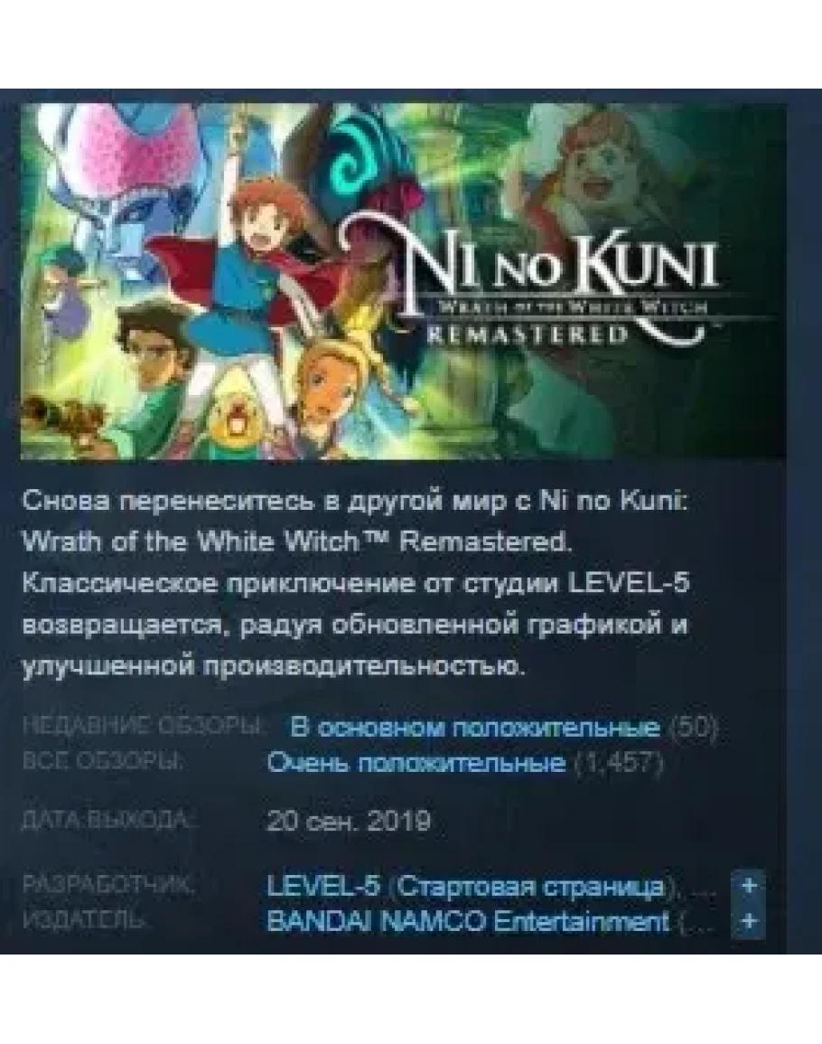 Вернитесь в другой мир вместе с Ni no Kuni: Wrath of the White Witch™ Remastered. Старое приключение возвращается, чтобы порадовать вас новой графикой и улучшенной производительностью.