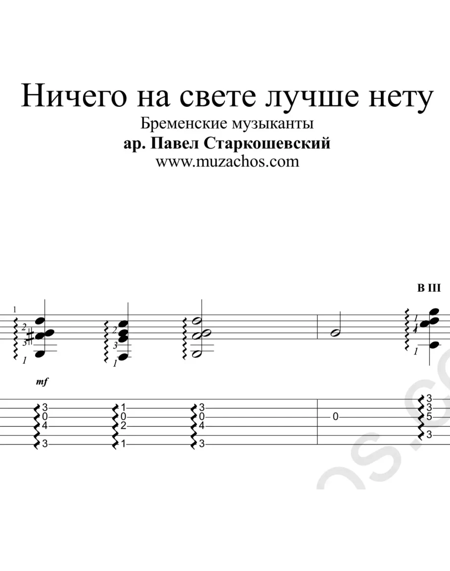 Ноты для гитары с аппликатурой для левой руки и табы к переложению песни из мультфильма Бременские музыканты "Ничего на свете лучше нету"