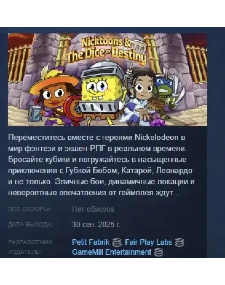 Переместитесь вместе с героями Nickelodeon в мир фэнтези и экшен-РПГ в реальном времени. Бросайте кубики и погружайтесь в насыщенные приключения с Губкой Бобом, Катарой, Леонардо и не только. Эпичные бои, динамичные локации и невероятные впечатления от геймплея ждут игроков всех возрастов.
