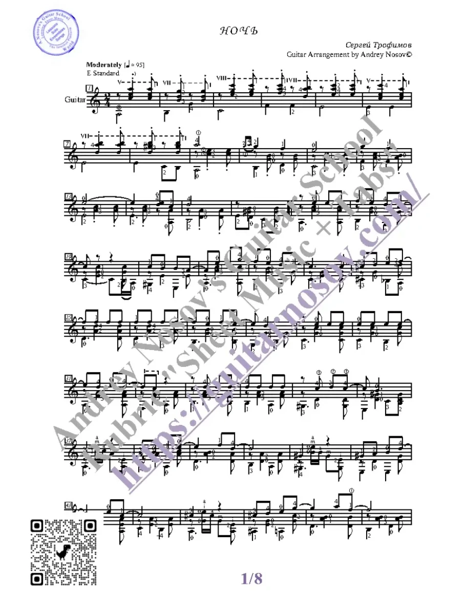 Кликните "Подробнее" для получения дополнительной информацииВашему вниманию предлагается композиция "Ночь (С.Трофимов)", предназначенная для исполнения на 6-ти струнной гитаре СОЛО. Запись выполнена нотами, сопровождена подробнейшей аппликатурой и продублирована табулатурой.