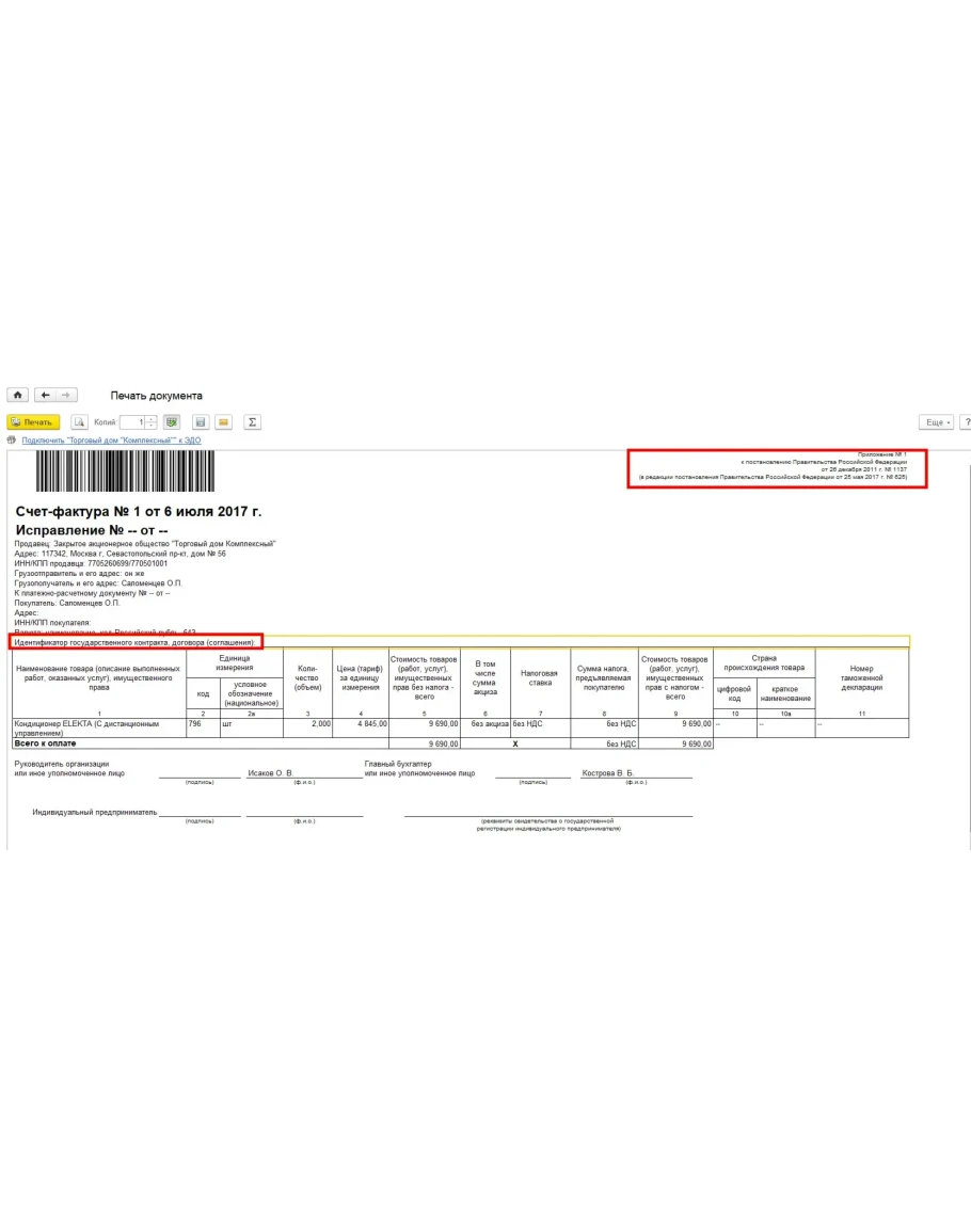 В новую форму счета-фактуры и универсального передаточного документа добавлен параметр "Идентификатор государственного контракта, договора (соглашения)".