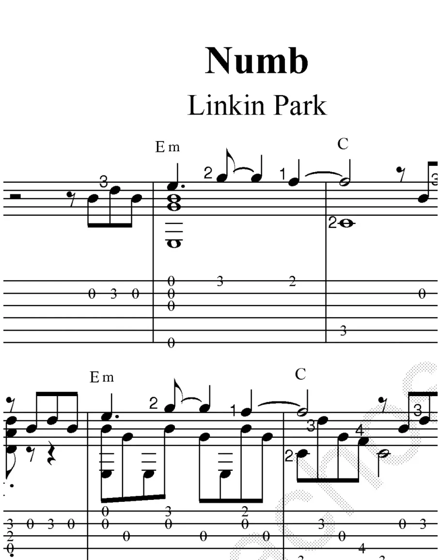 Ноты для одной гитары с аппликатурой левой руки продублированные табулатурой в форматах: tiff, pdf, а также файл GP5 для программы Guitar Pro к переложению песни Linkin Park "Numb"