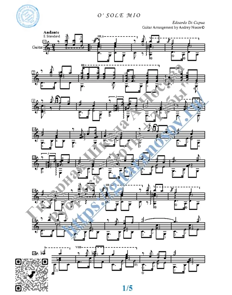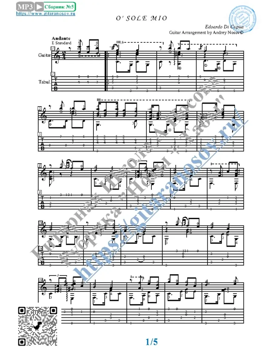 Кликните "Подробнее" для получения дополнительной информацииВашему вниманию предлагается композиция "O' Sole Mio (E.Di Capua)", предназначенная для исполнения на 6-ти струнной гитаре СОЛО. Запись выполнена нотами, сопровождена подробнейшей аппликатурой и продублирована табулатурой. И ещё…