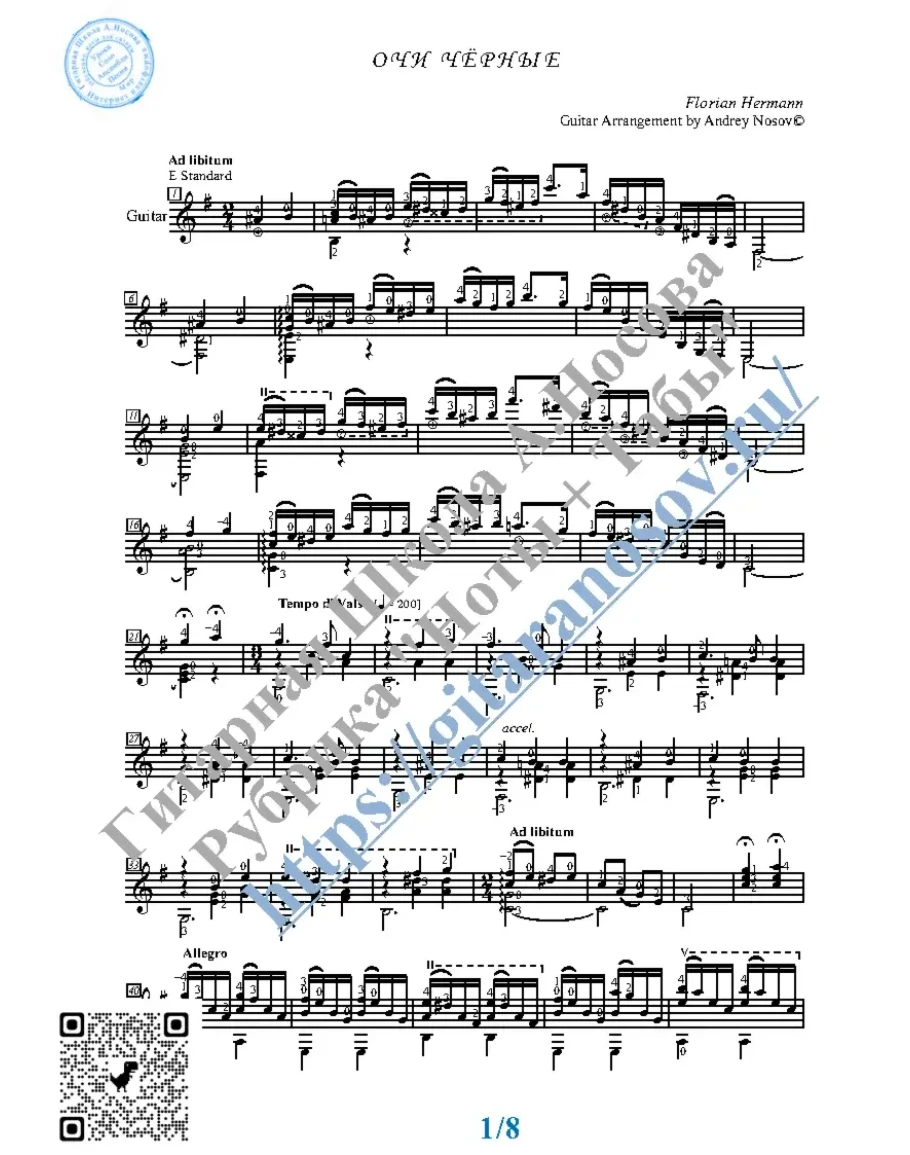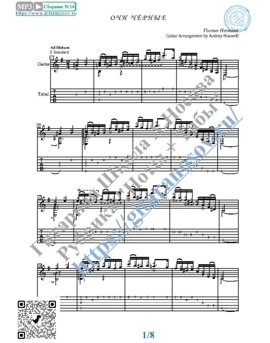 Товар включает в себя ноты с табулатурой и без табулатуры (в одном PDF). Прилагается ссылка на прослушивание / скачивание mp3.
