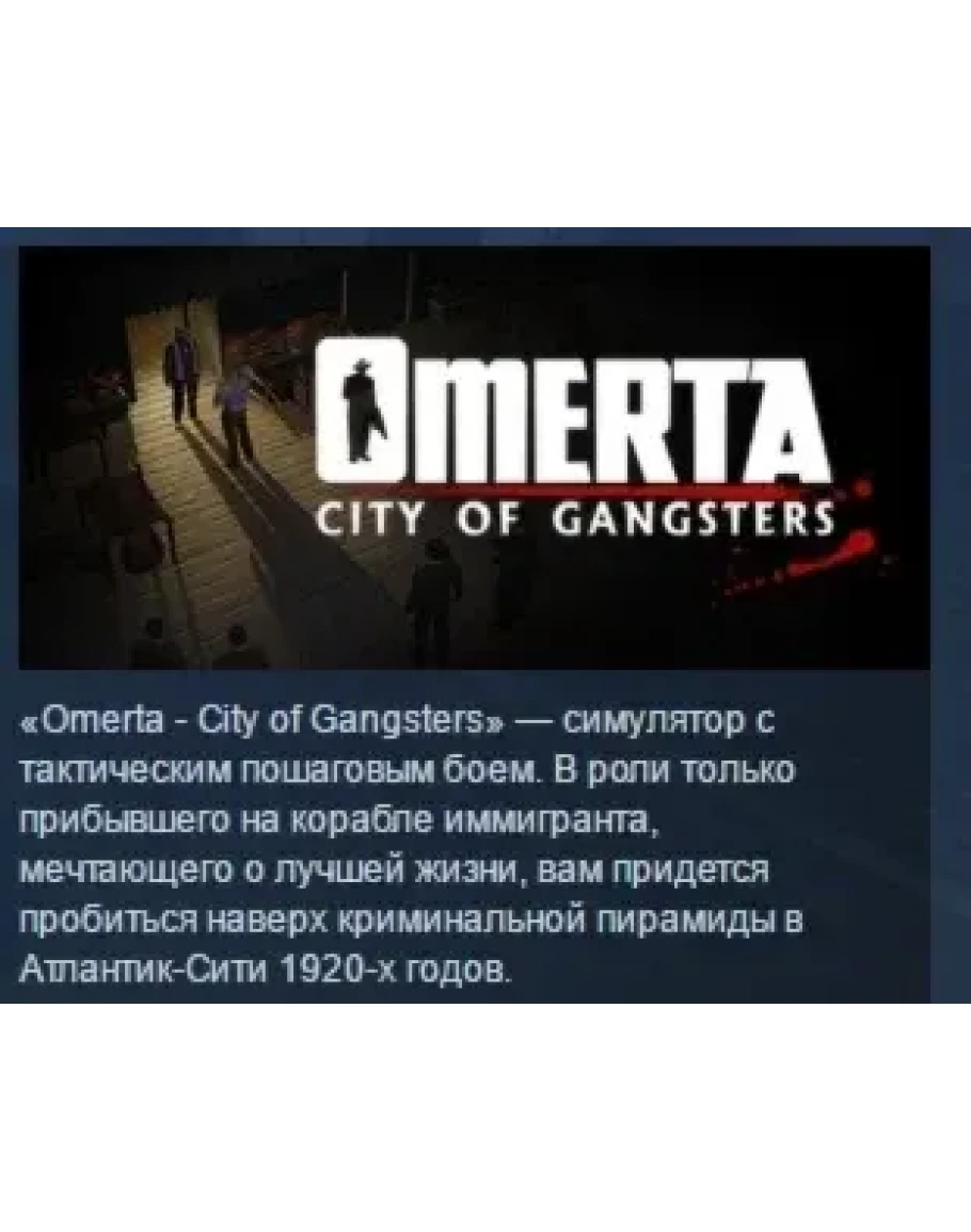 «Omerta - City of Gangsters» — симулятор с тактическим пошаговым боем. В роли только прибывшего на корабле иммигранта, мечтающего о лучшей жизни, вам придется пробиться наверх криминальной пирамиды в Атлантик-Сити 1920-х годов. Начав с небольших заданий, ваш персонаж организует банду и расширит влияние империи, отняв территорию у других гангстеров. В конечном итоге он построит собственный преступный синдикат и станет фактическим правителем Атлантик-Сити.