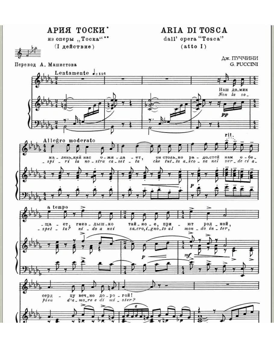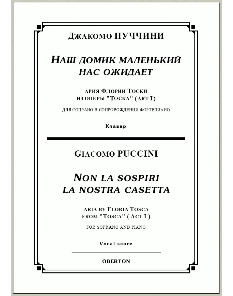 Джакомо ПУЧЧИНИ, "Наш домик маленький нас ожидает", ария Флории Тоски из I действия оперы "Тоска" для сопрано, ноты, вокальная музыка.