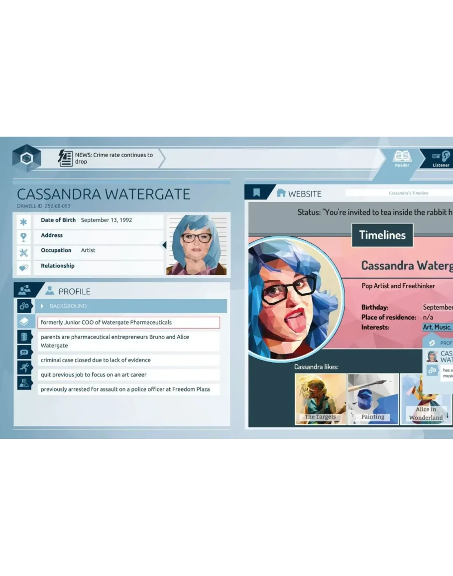 Orwell: Keeping an Eye On You — это игра в жанре визуальная новелла, разрабатываемая Osmotic Studios для платформы PC. Окружение в игре относится к cтилистике фантастика, а выделить особенности можно следующие: решения имеют последствия, глубокий сюжет, инди, антиутопия, для одного игрока, политика, хакерство, политическая, текстовая игра, детектив и другие. Вам будут доступны такие игровые режимы как «для одного игрока».