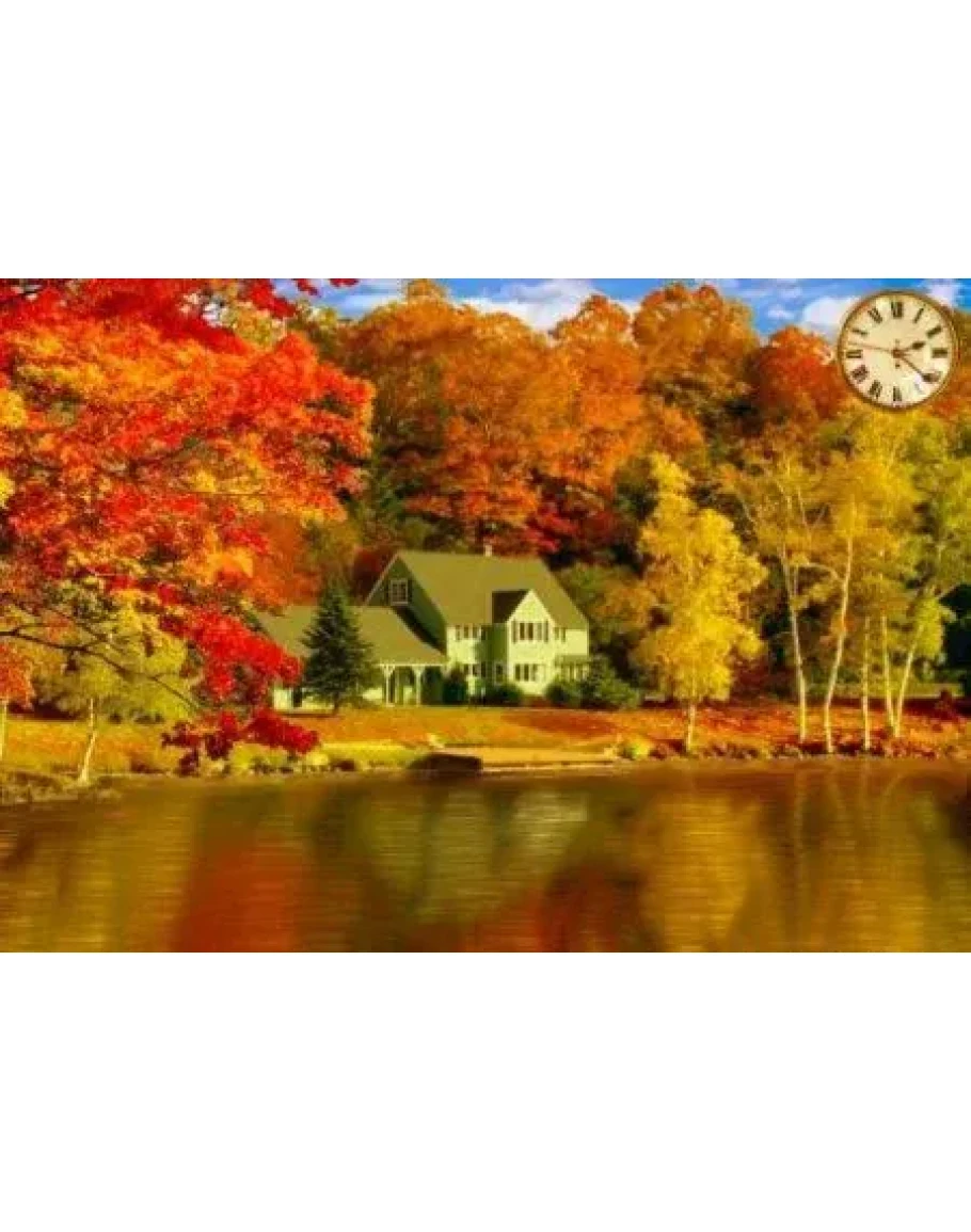 Пейзаж осеннего леса с домиком на фоне пруда. Анимации немного, только деревья и поверхность воды. Полная версия.