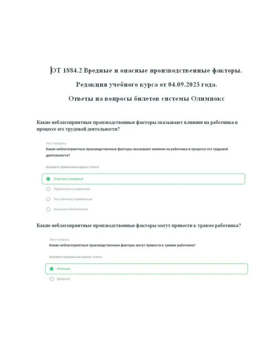 Ответы на вопросы билетов системы ОЛИМПОКС ОТ 1884.2 Вредные и опасные производственные факторы. Редакция учебного курса от 04.09. 2023 года.