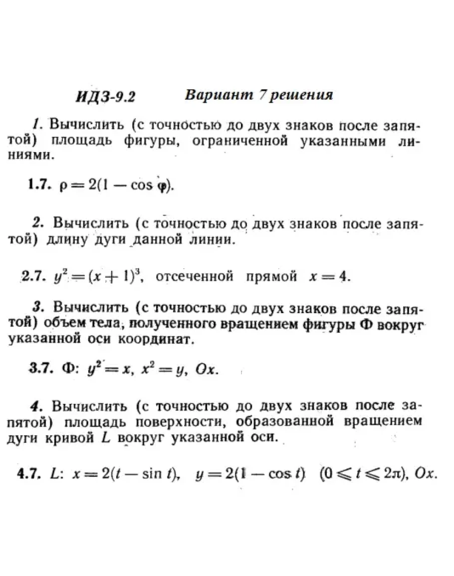 Решения 4-х заданий на приложения определенных интегралов к задачам геометрии из Рябушко части 2 ИДЗ 9.2 вариант 7