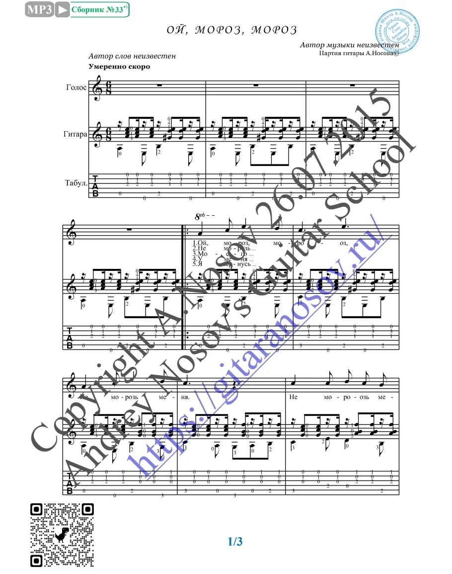 Кликните "Подробнее" для получения дополнительной информацииВашему вниманию предлагается композиция "Ой, мороз, мороз (Русская народная песня)", предназначенная для вокала в сопровождении 6-ти струнной гитары (pdf / png*). Запись выполнена нотами и включает в себя партию вокала с подтекстовкой, партию гитары с подробнейшей аппликатурой, текст песни (НА РУССКОМ ЯЗЫКЕ). Партия гитары продублирована табулатурой. Прилагается ссылка на скачивание mp3.