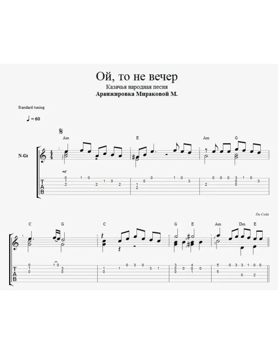 Авторская аранжировка для шестиструнной гитары от Марины Мираковой на народную песню "Ой, то не вечер".