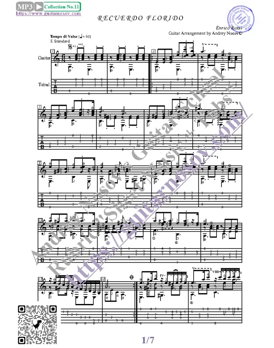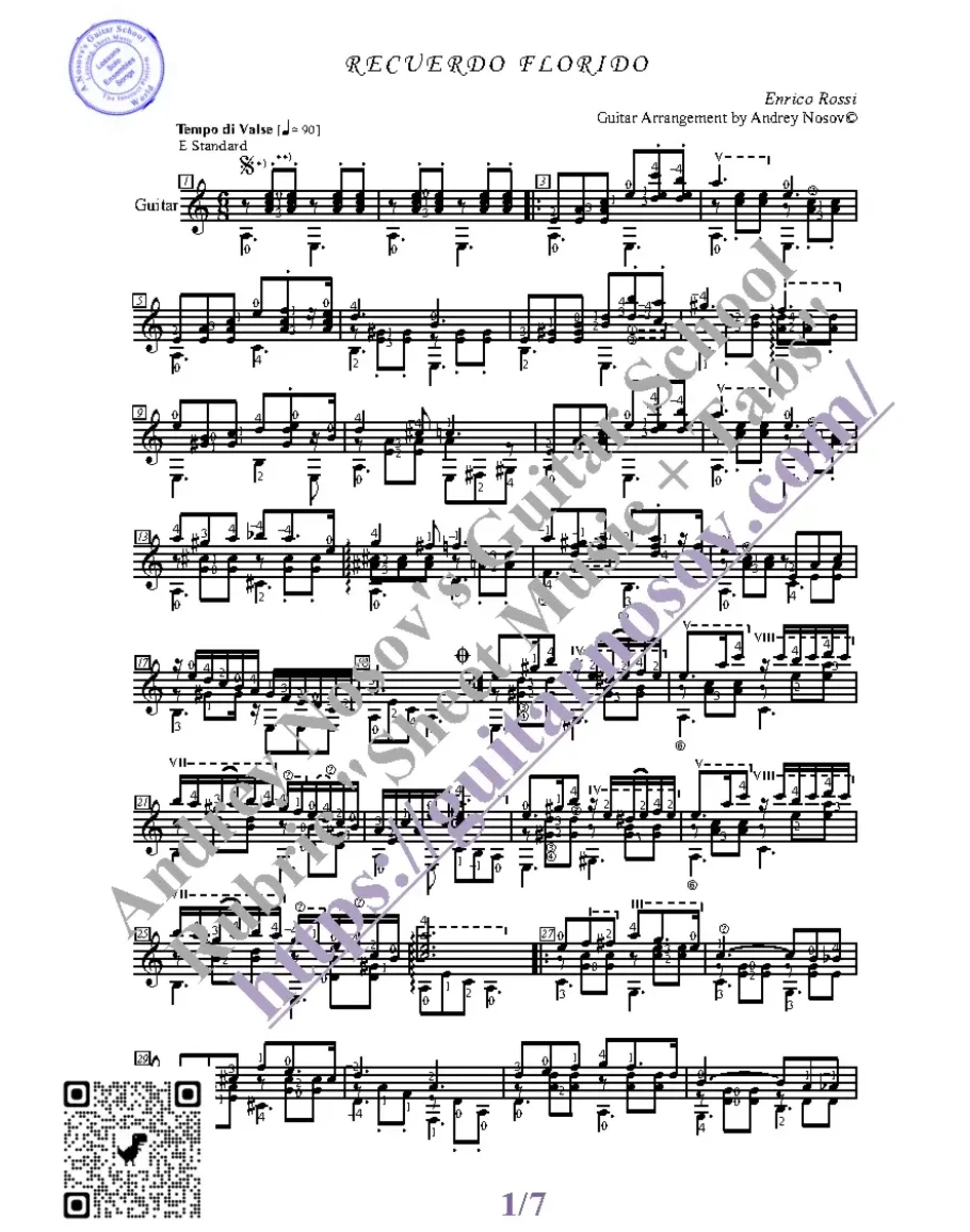 Кликните "Подробнее" для получения дополнительной информацииВашему вниманию предлагается композиция "Recuerdo Florido (E.Rossi)", предназначенная для исполнения на 6-ти струнной гитаре СОЛО. Запись выполнена нотами, сопровождена подробнейшей аппликатурой и продублирована табулатурой.