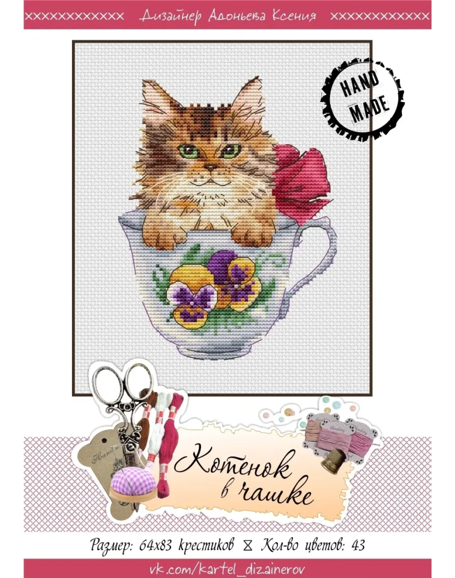 Эксклюзив. схема для вышивки крестом Котенок в чашке
