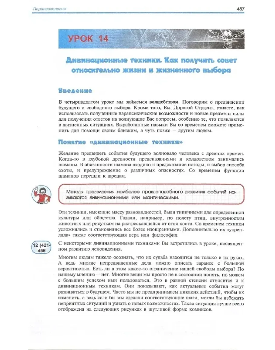 В четырнадцатом уроке мы займемся волшебством. Поговорим о предвидении будущего и свободного выбора. Кроме того, Вы узнаете, как использовать полученные парапсихические возможности и новые предметы силы для получения ответов на волнующие Вас вопросы, особенно те, что появляются в жизненных ситуациях. Выработанные навыки Вы со временем сможете применить для помощи своим близким, а чуть позже - другим людям.