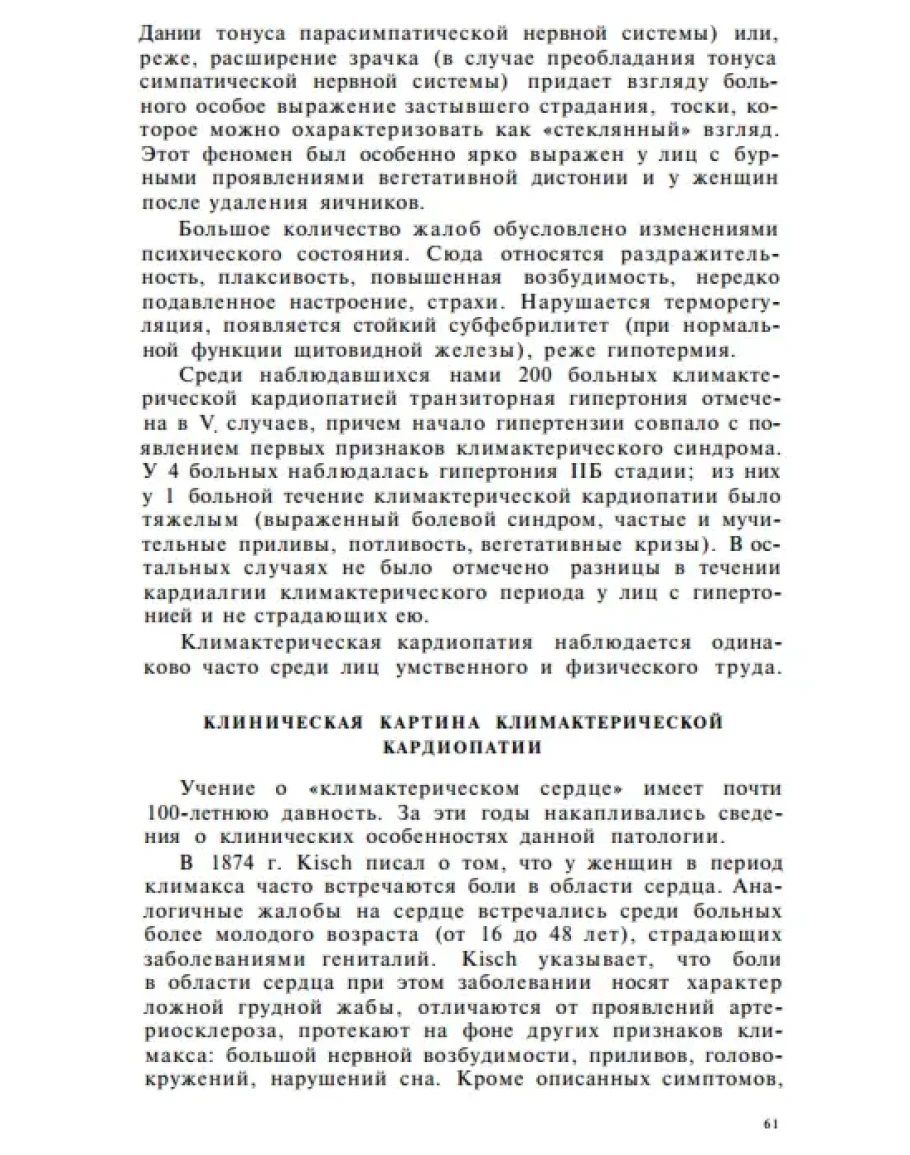 Еще одно достоинство книги можно отметить в этом кратком предисловии: авторы смогли в немногом сказать многое. Помимо общеизвестных форм, они осветили малоизвестные, но имеющие большое практическое значение кардиалгии: климактерическую кардиопатию (некоторые неопытные врачи трактуют это заболевание как мелкоочаговые инфаркты, месяцами держа больных на постельном режиме), кардиофобии, «пубертатное сердце» и пр.