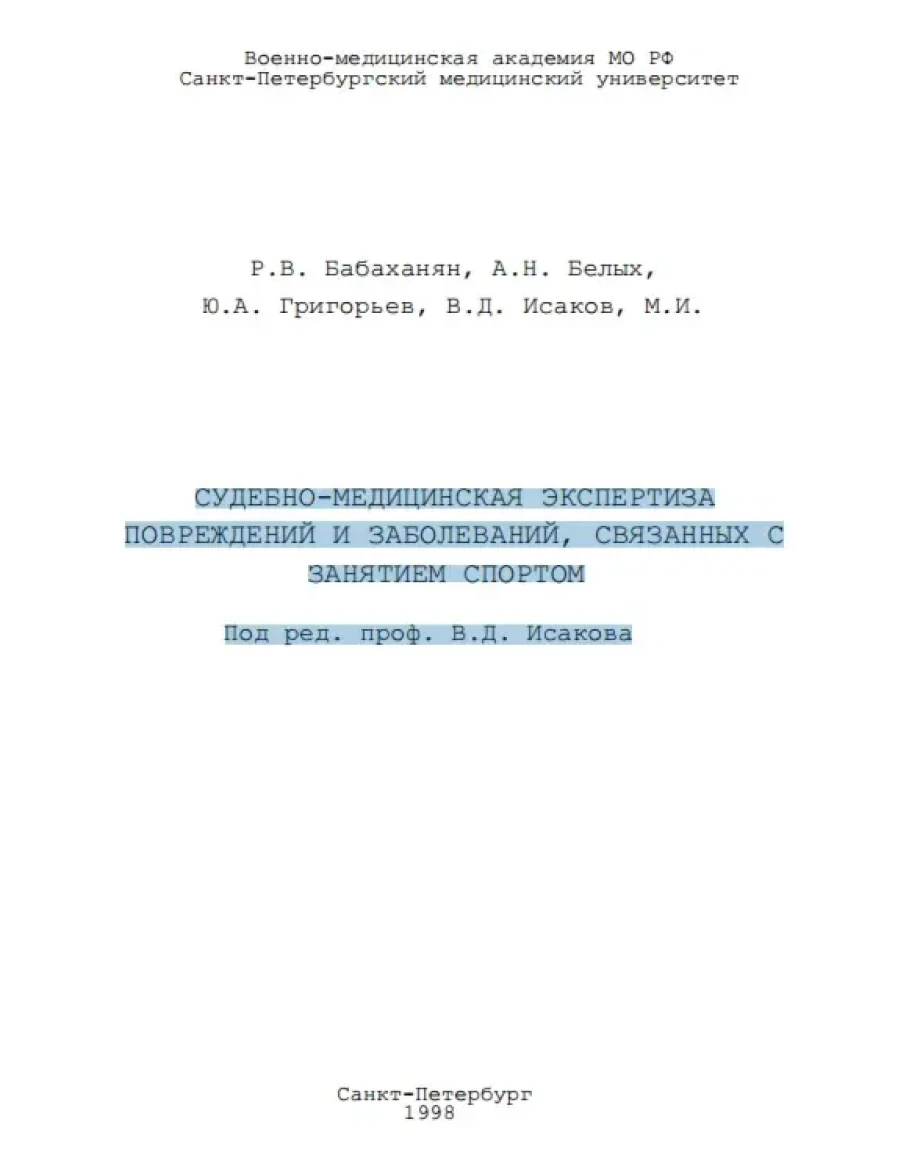 Бабаханян Р.В., Белых А.Н., Григорьев Ю.А., Исаков В.Д., Круть М.И. Судебно-медицинская экспертиза повреждений и заболеваний, связанных с занятием спортом