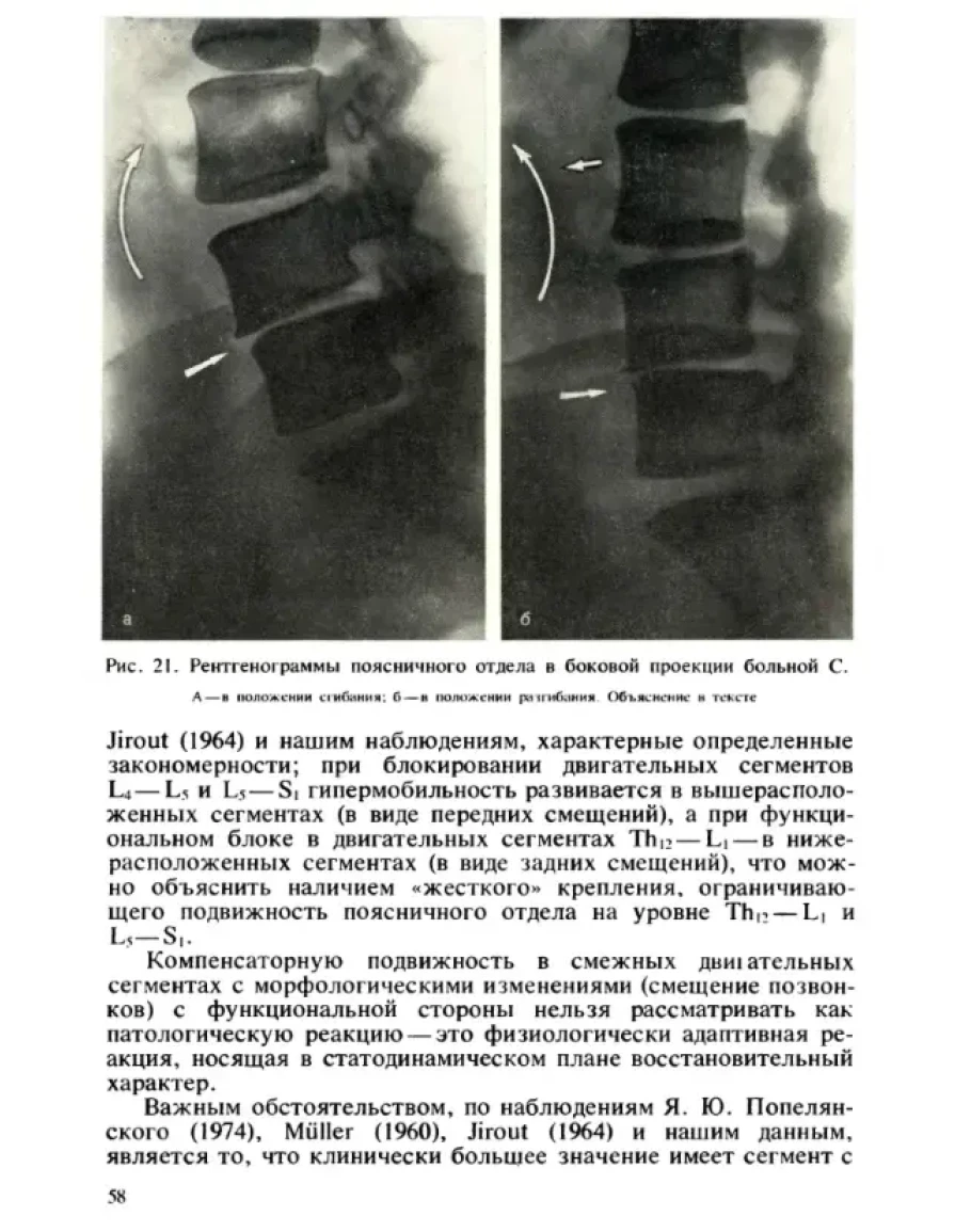 Монография посвящена малоизученной, но актуальной теме—смещениям поясничных позвонков. Работа основана на результатах анализа большого числа случаев смещений поясничных позвонков, обнаруженных при рентгенологическом исследовании пояснично-крестцового отдела позвоночника как у взрослых, так и у детей. Новая унифицированная методика рентгенографии позвоночника и методика латерографии в задней проекции в сочетании с функциональным рентгенологическим исследованием (ФРИ) позволили получить рентгенограммы большой информативности и выявить бессимптомные смещения позвонков еще в функциональной фазе. Определены две взаимопротивоположные формы дисфункции двигательного сегмента: нестабильность, реализующаяся различными видами смещений позвонков, и адинамия (функциональный блок) приведены их рентгенологические признаки. В смещении позвонков выделены две фазы: функциональная и необратимая отражена их связь с клинической картиной, в том числе со степенью болевого синдрома. Подробно изложены рентгенодиагностика и клиника различных видов смещений. Введены два новых понятия: «темп» и «предел протяженности» смещения позвонков, имеющие исключительное значение в вопросах прогнозирования. Для оценки клинико-рентгенологической картины смещений позвонков предложен новый критерий-показатель нестабильности, играющий главную роль при выборе метода лечения, трудоустройстве взрослых и профориентации детей. Новая терминология и классификация нестабильных состояний позвоночника включают пять видов смещений позвонков.