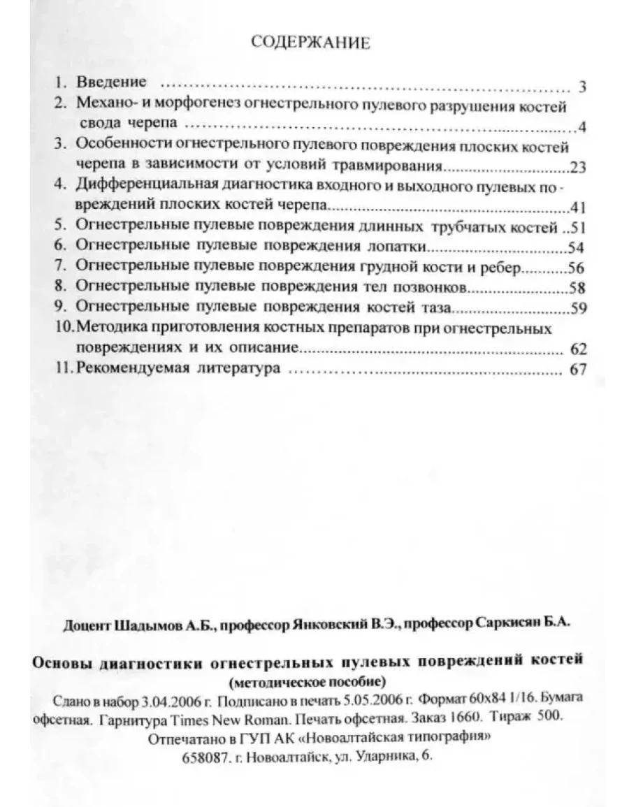 Методическая рекомендация "Основы диагностики огнестрельных пулевых повреждений костей" под ред., Шадымова А.Б., и соавт., рассматривает морфогенез и механику огнестрельного поражения различных костей человека: плоских костей черепа, тел позвонков, костей таза, длинных трубчатых костей, костей свода черепа. Изложены основы судебно-медицинской экспертизы огнестрельных пулевых повреждений костей. Вы можете скачать методическую рекомендацию "Основы диагностики огнестрельных пулевых повреждений костей" для ознакомления, либо читать методическую рекомендацию онлайн.