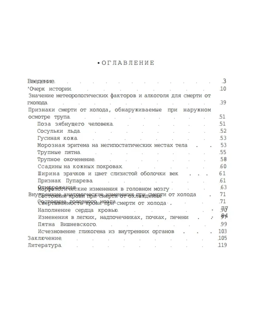 Основное внимание в книге уделено вопросам секционной диагностики смерти от охлаждения. На основании исследований коллектива кафедры судебной медицины Т М И и литературных данных дается анализ диагностической ценности каждого из признаков холодовой смерти и всего комплекса их в целом.