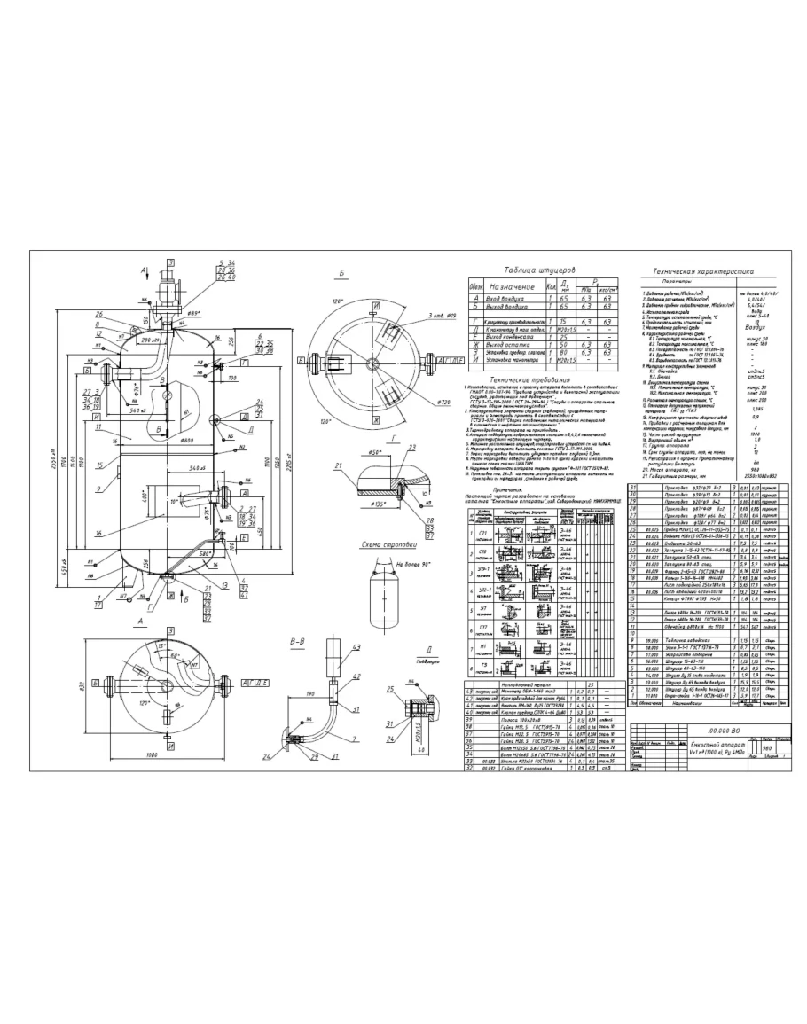 Чертеж воздухосборника V=1 м.куб Р=4 МПа (формат DWG). В коплекте чертеж общего вида, чертежи сборочных единиц, чертежи деталей, расчет на прочность.