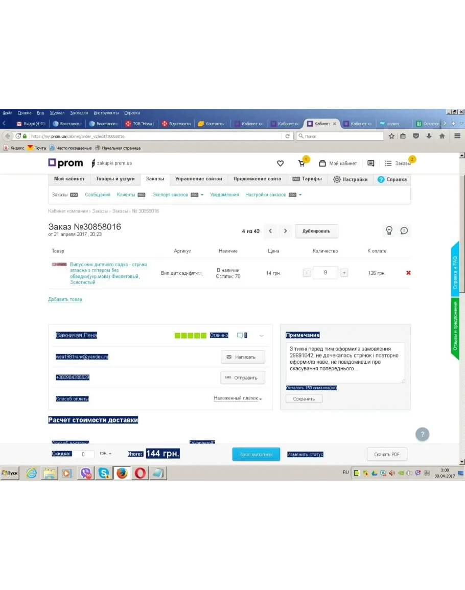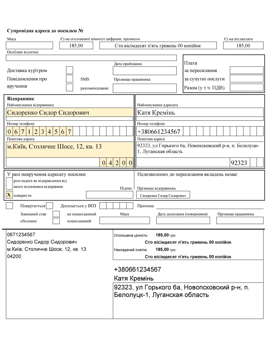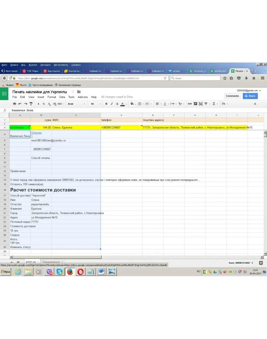 Продавцы товаров на портале prom.ua могут сократить ручной труд заполнения данных для отправки посылок "Укрпочтой" до минимума. Время создания наклейки для посылки и сопроводительного бланка (его оформление занимало ранее до 10-ти минут) можно сократить до 10-ти секунд и исключить возможные ошибки при переносе информации. Все, что нужно - скопировать с карточки заказа покупателя (Заказ №...) на портале prom.ua часть информации с адресом покупателя, суммой заказа (выделяется мышкой фрагмент страницы) и вставить в google-sheets документ, выбрать, с наложенным платежем или без, и распечатать готовый результат: "Супровiдна адреса до посилки" (Сума оголошеної цiнностi, Сума пiсляплати (цифрами та прописом), адреса відправника, одержувача (адресата)). Все данные о покупателе, скопированные в браузере с портала, сортируются с помощью формул, прописанных в файле google-sheets и автоматически заносятся в нужные графы сопроводительного бланка для посылки. Вам будет предоставлена ссылка на файл google-sheets - перейдите по данной ссылке и создайте копию ("File" -> "Make a copy...") - он сохранится в Вашем аккаунте сервиса Google и Вы сможете его редактировать (вносить информацию с заказов на портале prom.ua для распечатки наклеек на посылки с сопроводительным документом.