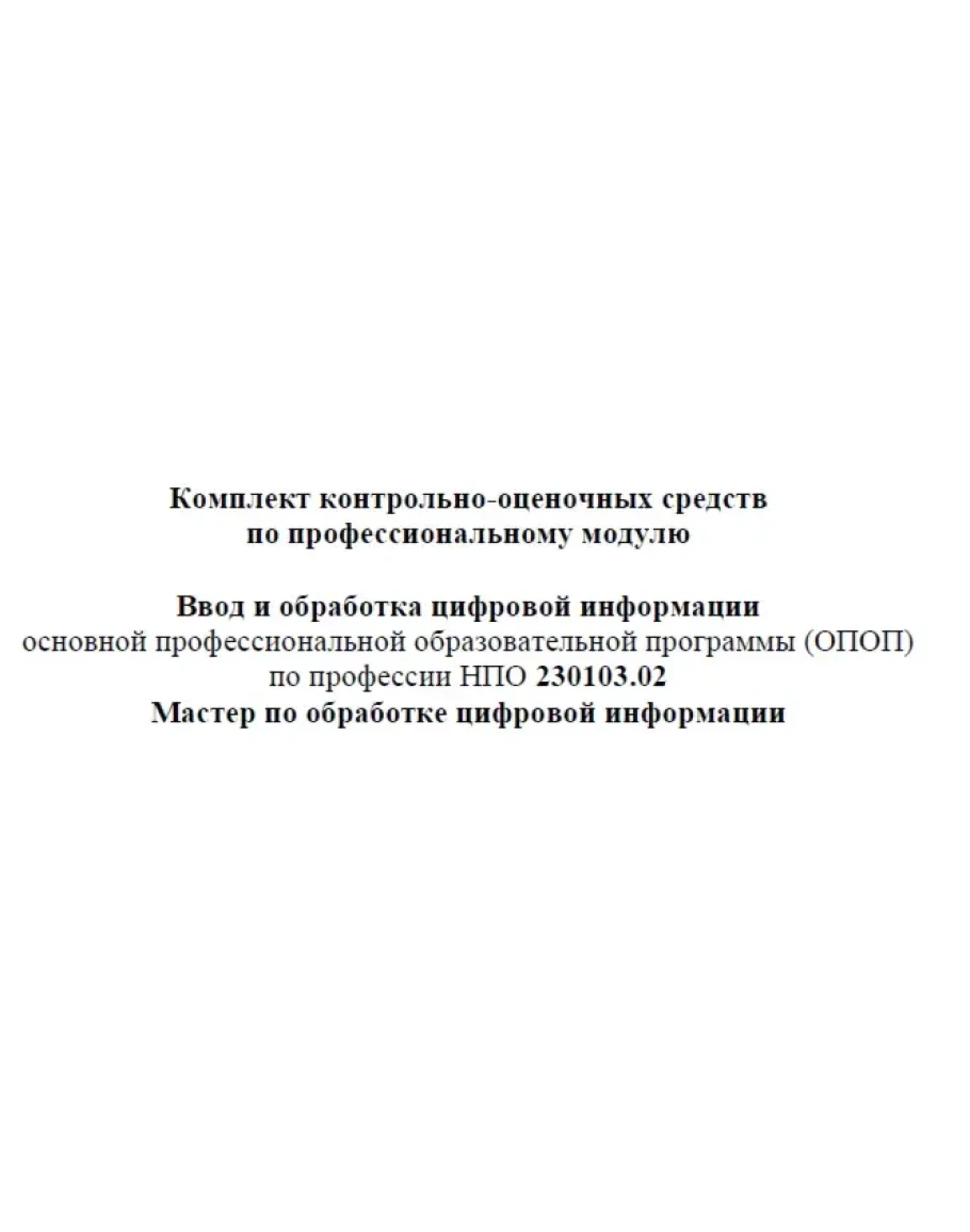 Контрольно-оценочные средства по профессиональному модулю ПМ.01 Ввод и обработка цифровой информации по профессии Мастер по обработке цифровой информации! Разработаны в соответствии с требованиями ФГАУ ФИРО по профессии начального профессионального образования (НПО) Мастер по обработке цифровой информации.