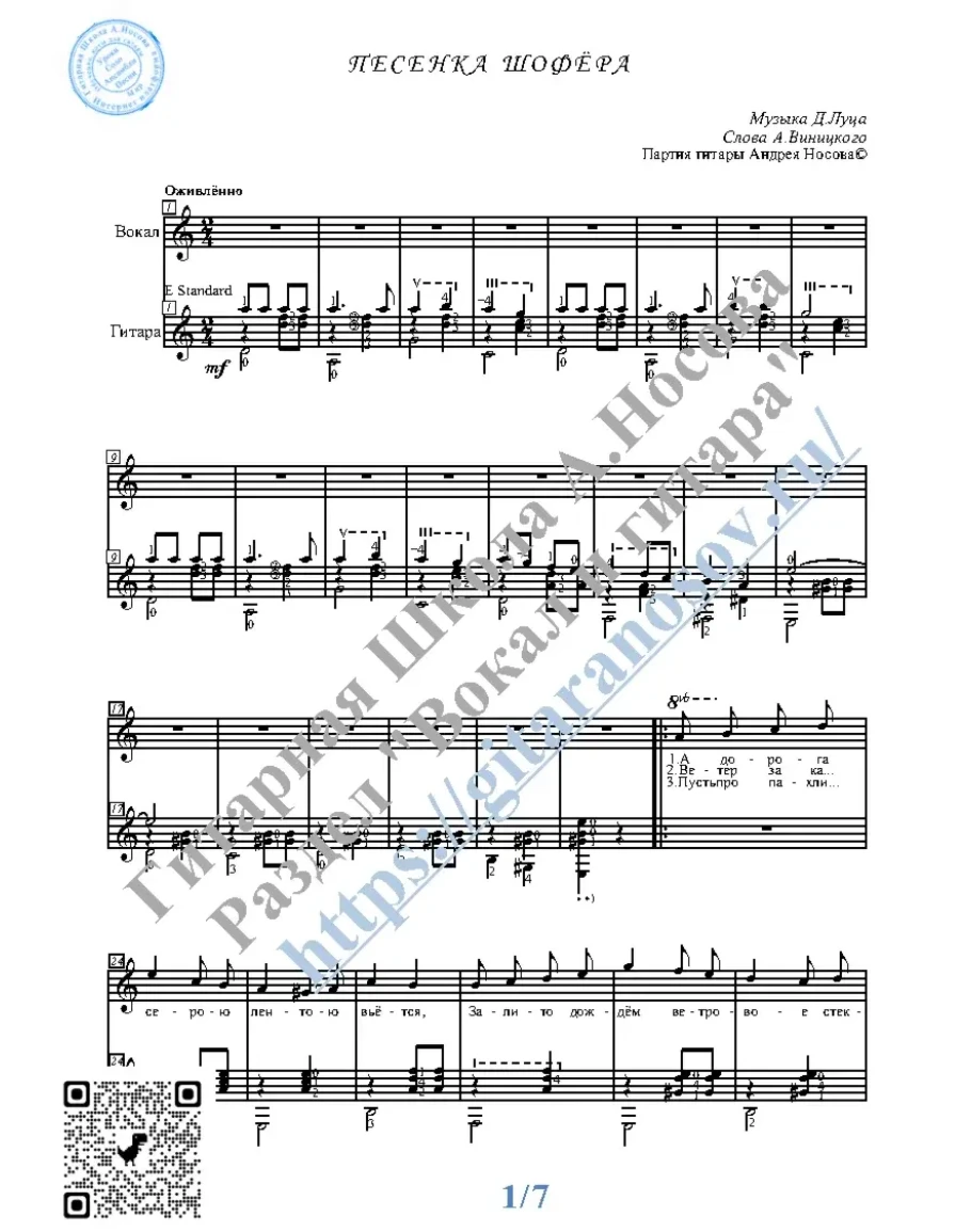 Кликните "Подробнее" для получения дополнительной информацииВашему вниманию предлагается композиция "Песенка шофёра (муз.Д.Луца, сл.А.Виницкого)", предназначенная для вокала в сопровождении 6-ти струнной гитары. Запись выполнена нотами и включает в себя партию вокала с подтекстовкой, партию гитары с подробнейшей аппликатурой и текст песни (НА РУССКОМ).