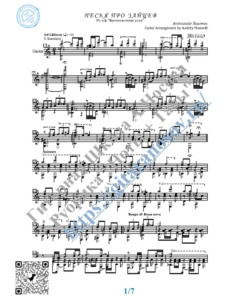 Кликните "Подробнее" для получения дополнительной информацииВашему вниманию предлагается песня "Песня про зайцев" (А.Зацепин), из к/ф "Бриллиантовая рука", предназначенная для исполнения на 6-ти струнной гитаре соло. Запись выполнена нотами, сопровождена подробнейшей аппликатурой и продублирована табулатурой. И ещё…
