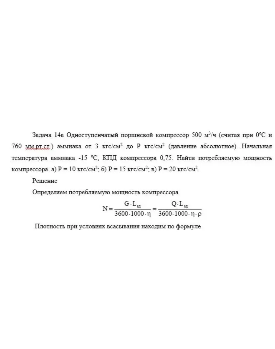 Задача 14а Одноступенчатый поршневой компрессор 500 м3/ч (считая при 0?С и 760 мм.рт.ст.) аммиака от 3 кгс/см2 до Р кгс/см2 (давление абсолютное). Начальная температура аммиака -15 ?С, КПД компрессора 0,75. Найти потребляемую мощность компрессора. а) Р = 10 кгс/см2; б) Р = 15 кгс/см2; в) Р = 20 кгс/см2.