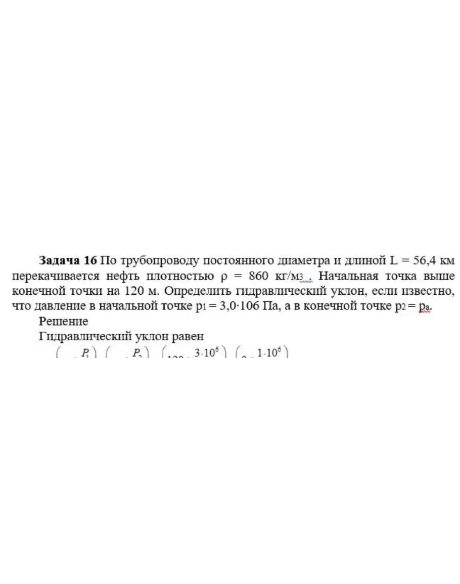 Задача 16 По трубопроводу постоянного диаметра и длиной L = 56,4 км перекачивается нефть плотностью ρ = 860 кг/м3 . Начальная точка выше конечной точки на 120 м. Определить гидравлический уклон, если известно, что давление в начальной точке p1 = 3,0∙106 Па, а в конечной точке p2 = pа.