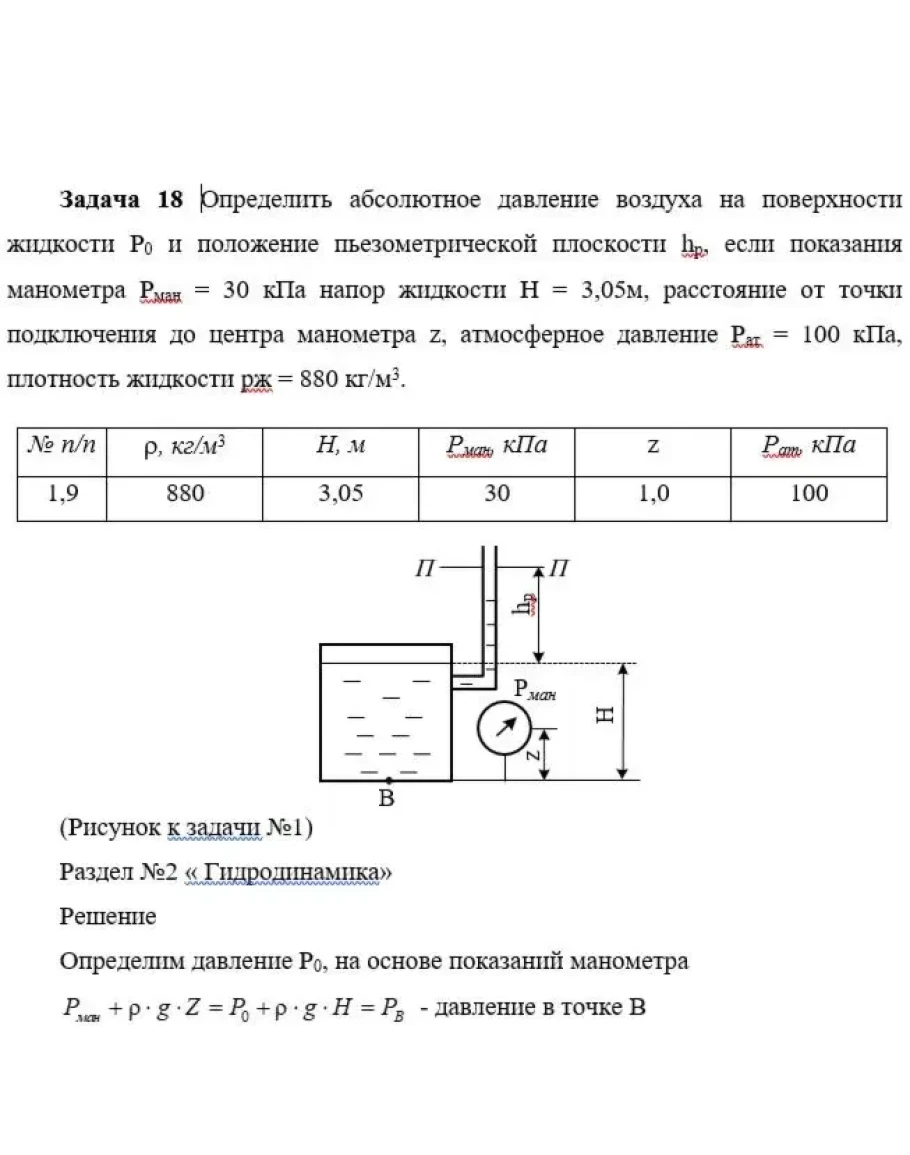 Задача 18 Определить абсолютное давление воздуха на поверхности жидкости Р0 и положение пьезометрической плоскости hp, если показания манометра Рман = 30 кПа напор жидкости Н = 3,05м, расстояние от точки подключения до центра манометра z, атмосферное давление Рат = 100 кПа, плотность жидкости рж = 880 кг/м3.