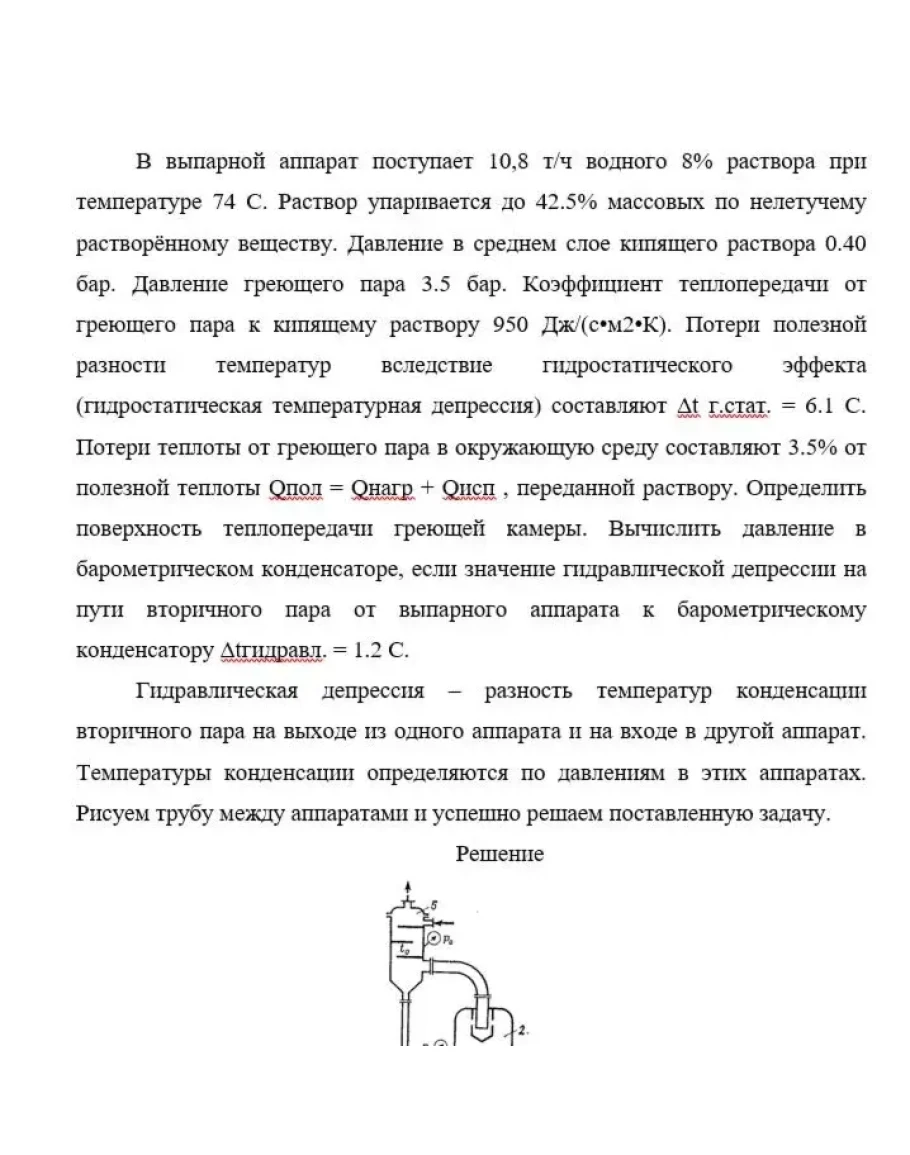 В выпарной аппарат поступает 10,8 т/ч водного 8% раствора при температуре 74 С. Раствор упаривается до 42.5% массовых по нелетучему растворённому веществу. Давление в среднем слое кипящего раствора 0.40 бар. Давление греющего пара 3.5 бар. Коэффициент теплопередачи от греющего пара к кипящему раствору 950 Дж/(с•м2•К). Потери полезной разности температур вследствие гидростатического эффекта (гидростатическая температурная депрессия) составляют Δt г.стат. = 6.1 С. Потери теплоты от греющего пара в окружающую среду составляют 3.5% от полезной теплоты Qпол = Qнагр + Qисп , переданной раствору. Определить поверхность теплопередачи греющей камеры. Вычислить давление в барометрическом конденсаторе, если значение гидравлической депрессии на пути вторичного пара от выпарного аппарата к барометрическому конденсатору Δtгидравл. = 1.2 С.