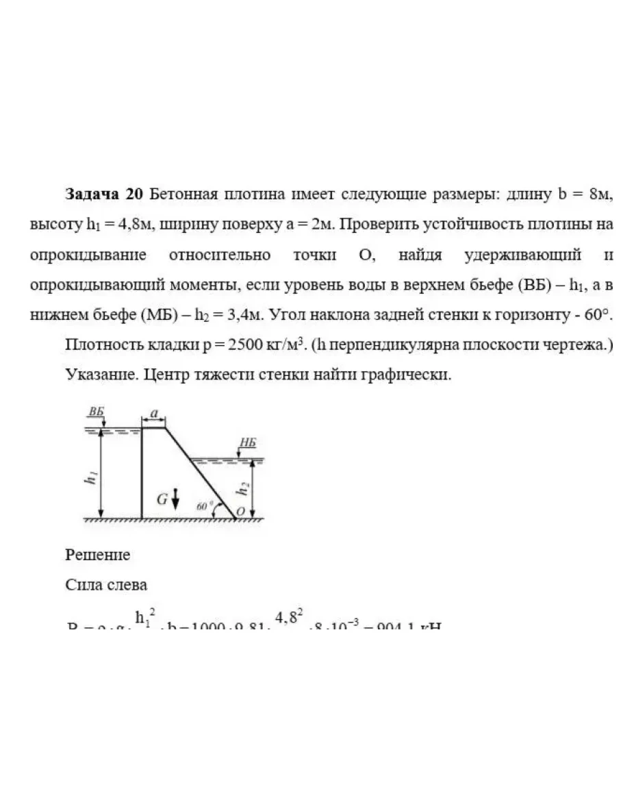 Задача 20 Бетонная плотина имеет следующие раз¬меры: длину b = 8м, высоту h1 = 4,8м, ширину поверху а = 2м. Проверить устойчивость плотины на опрокидывание относительно точки О, найдя удер¬живающий и опрокидывающий моменты, если уровень воды в верхнем бьефе (ВБ) – h1, а в нижнем бьефе (МБ) – h2 = 3,4м. Угол наклона задней стенки к горизонту - 60°.