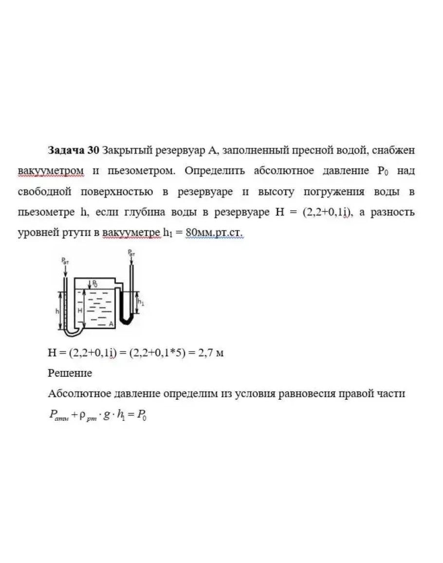Задача 30 Закрытый резервуар А, заполненный пресной водой, снабжен вакууметром и пьезометром. Определить абсолютное давление Р0 над свободной поверхностью в резервуаре и высоту погружения воды в пьезометре h, если глубина воды в резервуаре Н = (2,2+0,1i), а разность уровней ртути в вакууметре h1 = 80мм.рт.ст.
