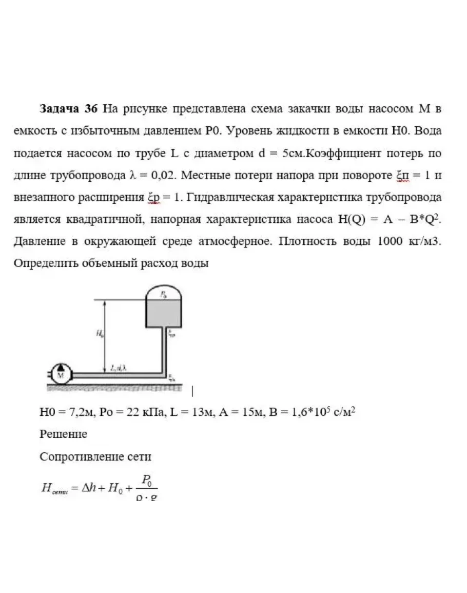 Задача 36 На рисунке представлена схема закачки воды насосом М в емкость с избыточным давлением Р0. Уровень жидкости в емкости Н0. Вода подается насосом по трубе L с диаметром d = 5см.Коэффициент потерь по длине трубопровода λ = 0,02. Местные потери напора при повороте ξп = 1 и внезапного расширения ξр = 1. Гидравлическая характеристика трубопровода является квадратичной, напорная характеристика насоса H(Q) = A – B*Q2. Давление в окружающей среде атмосферное. Плотность воды 1000 кг/м3. Определить объемный расход воды