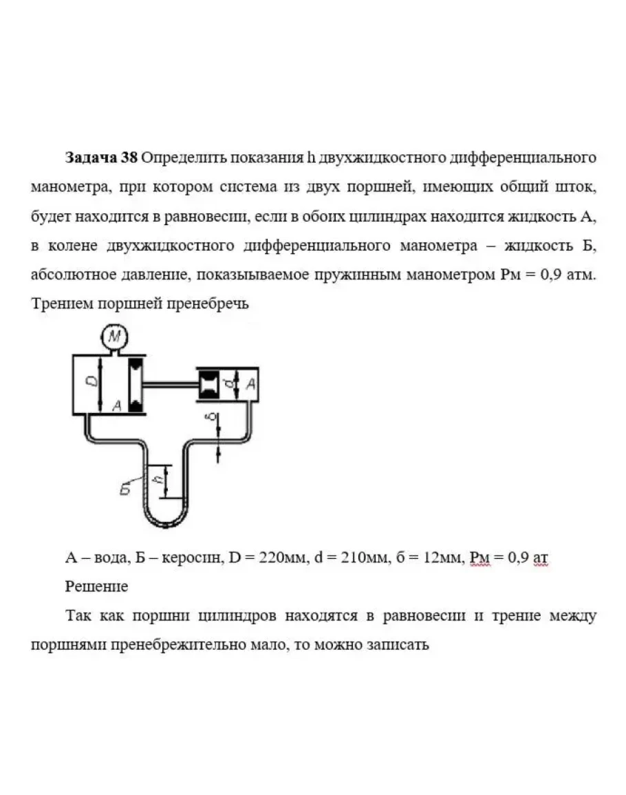 Задача 38 Определить показания h двухжидкостного дифференциального манометра, при котором система из двух поршней, имеющих общий шток, будет находится в равновесии, если в обоих цилиндрах находится жидкость А, в колене двухжидкостного дифференциального манометра – жидкость Б, абсолютное давление, показыываемое пружинным манометром Рм = 0,9 атм. Трением поршней пренебречь