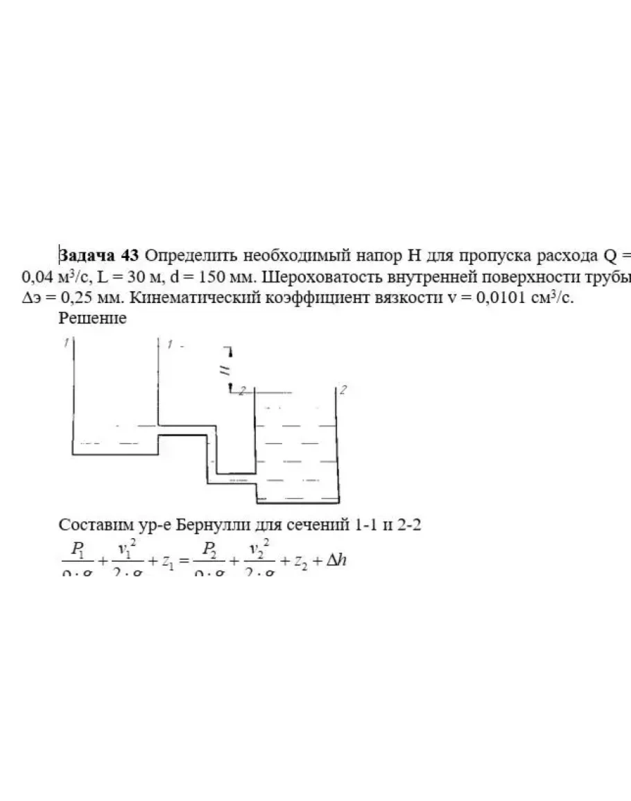 Задача 43 Определить необходимый напор Н для пропуска расхода Q = 0,04 м3/с, L = 30 м, d = 150 мм. Шероховатость внутренней поверхности трубы Δэ = 0,25 мм. Кинематический коэффициент вязкости v = 0,0101 см3/с.