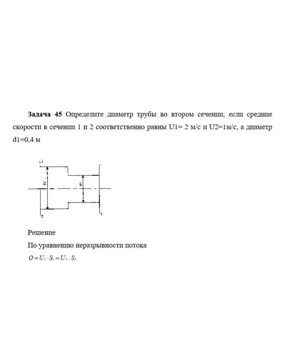 Задача 45 Определите диаметр трубы во втором сечении, если средние скорости в сечении 1 и 2 соответственно равны U1= 2 м/с и U2=1м/с, а диаметр d1=0,4 м